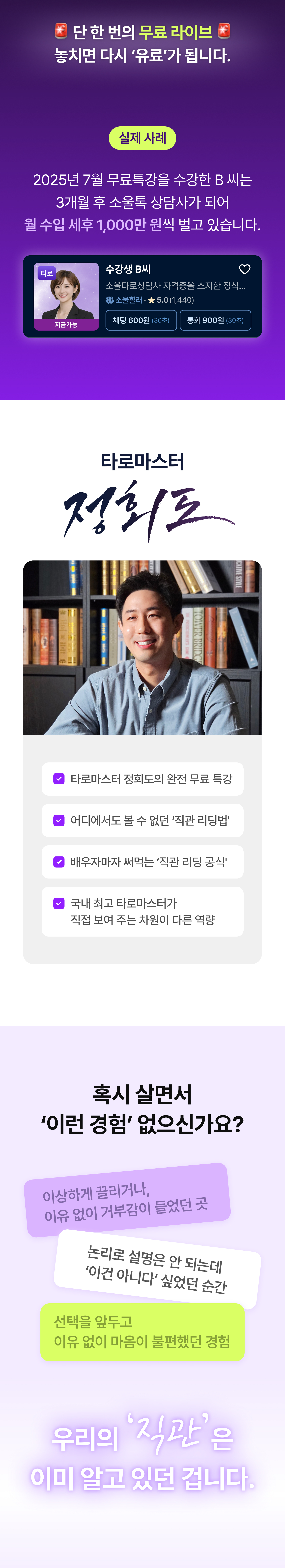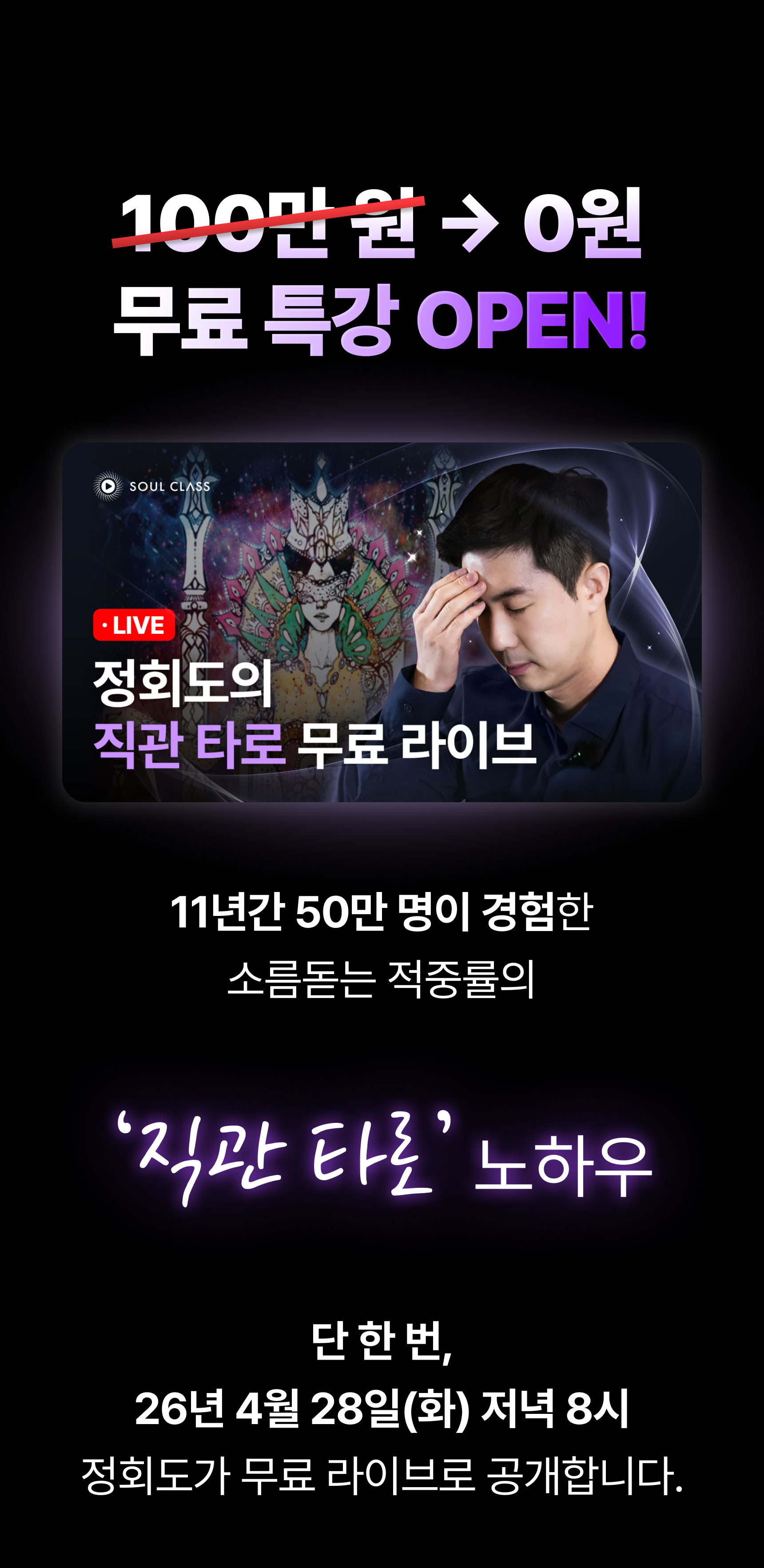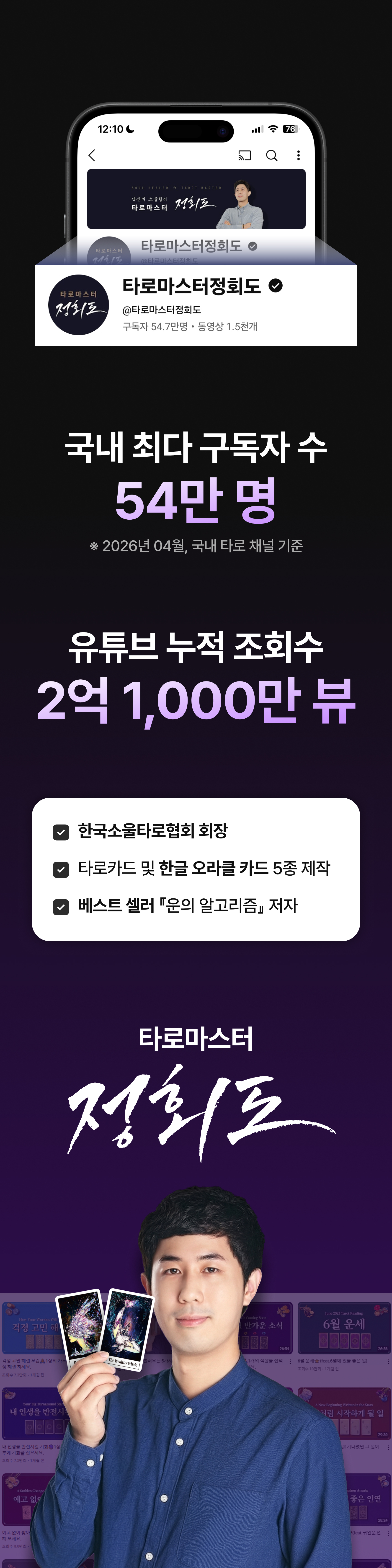 국내 타로유튜버 1위 타로마스터 정회도가 무료로 공개하는 직관타로 라이브! 4월 28일 8시, 단 1시간만 무료입니다